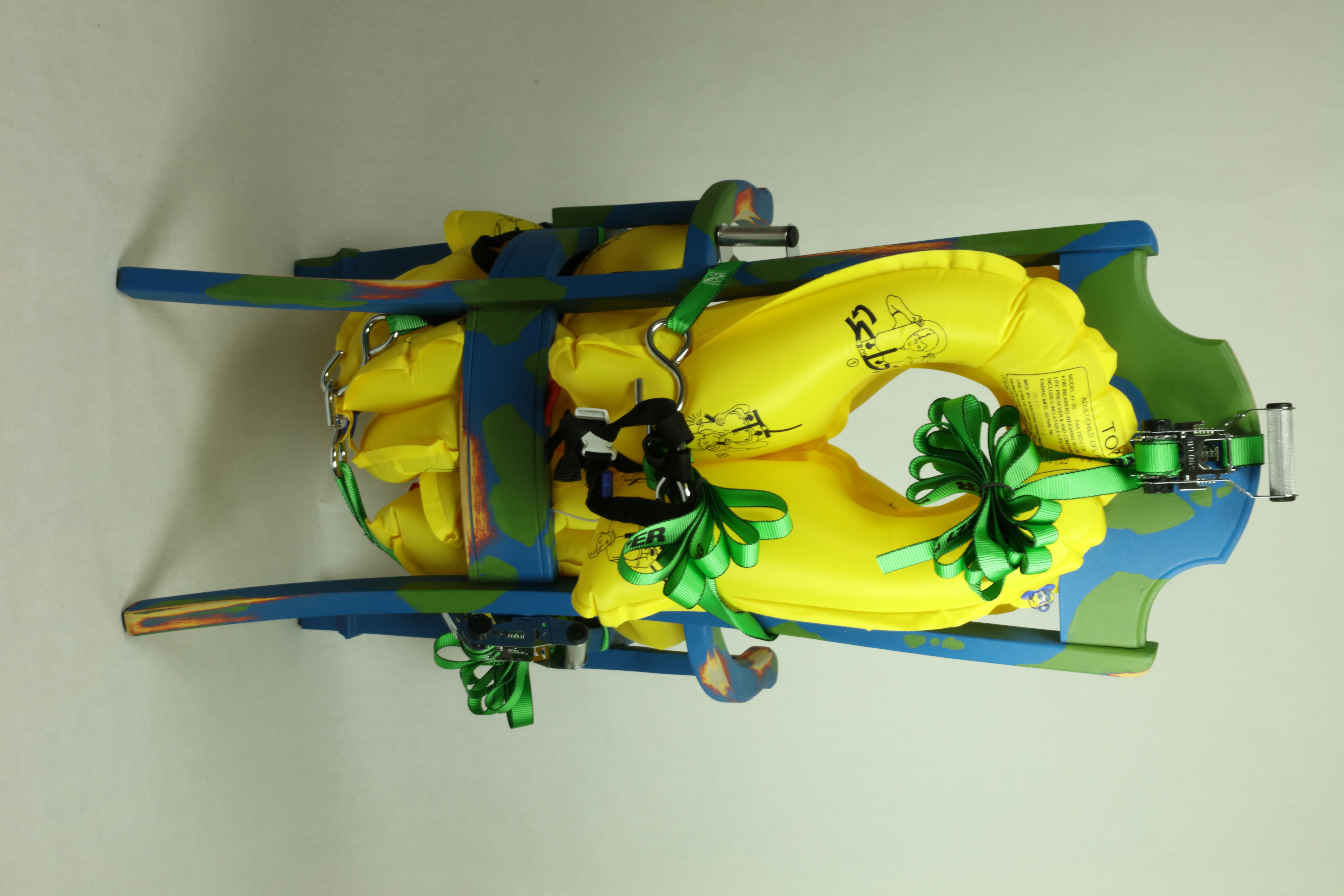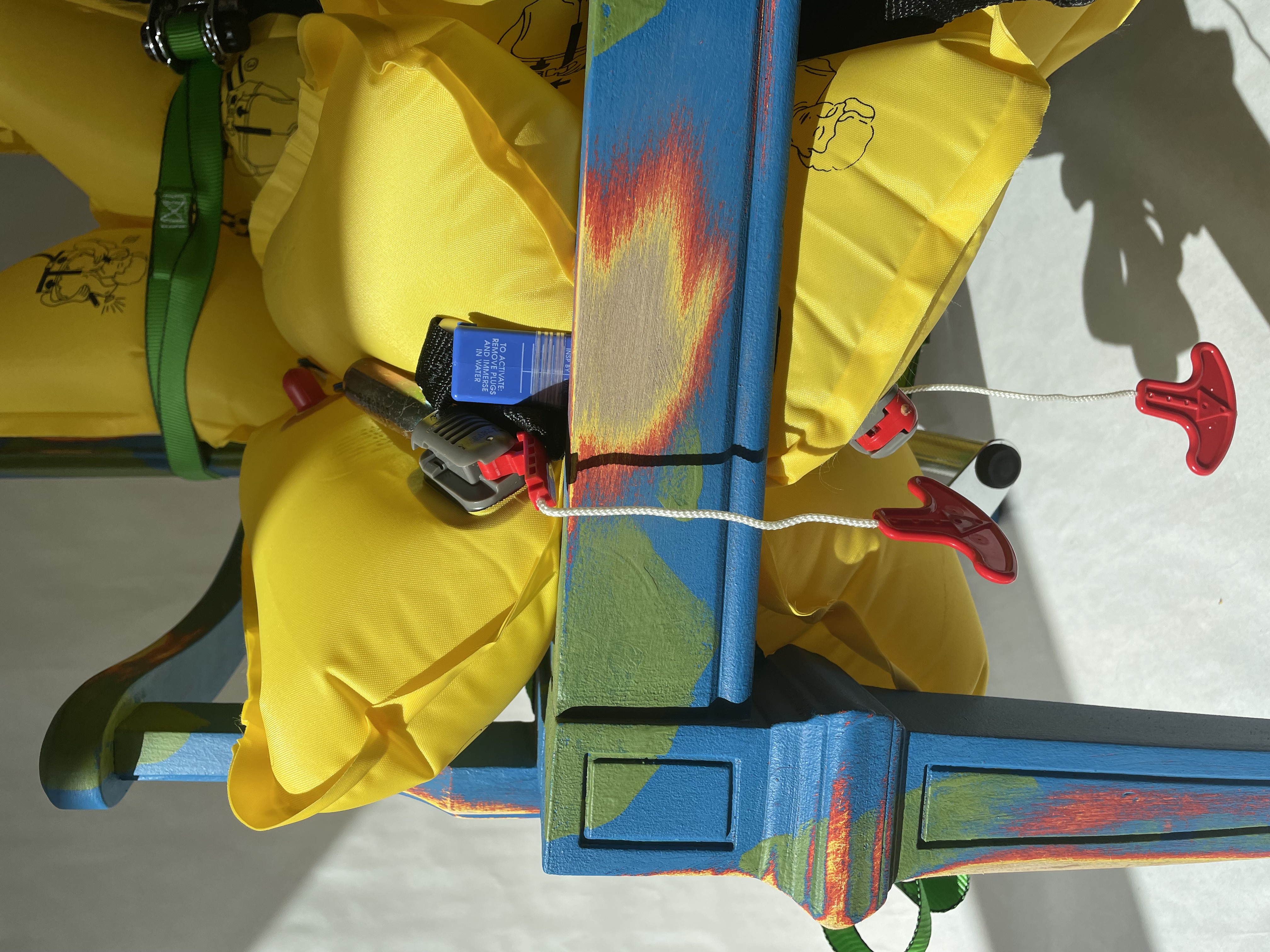As a commentary on Climate Change and Overconsumption this project focuses on targeting waste materials at the end of their life cycle. The Chair was discard- ed and broken on the side of the street and the Aircraft Life Jackets are past their expiry date and are no longer allowed to be used on planes any more. In the finishing process of the chair I painted 5 layers of different colors of paint with the outer surface reflecting the earth. As the chair is worn down it reveals a fire pallet to show that the earth is burning and is on fire. All the elements come together to provide a message that waste can be beautiful and we don’t need new materials to produce furniture.